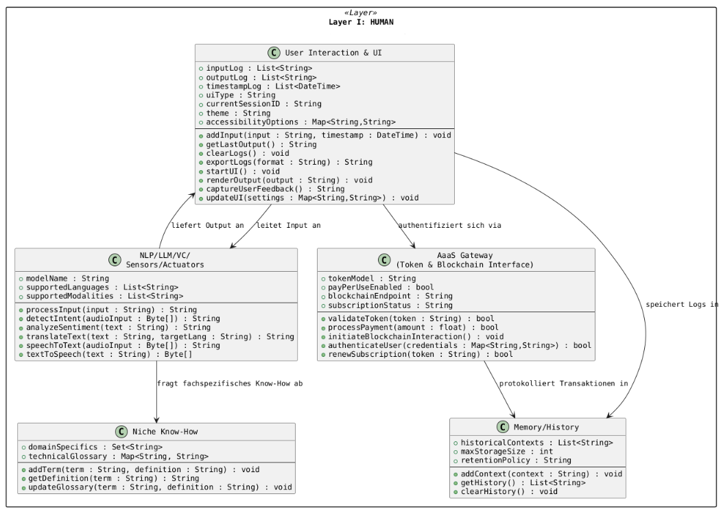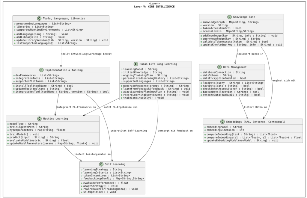 | Layer V: CORE INTELLIGENCE | This layer encompasses central AI components such as the knowledge base, data management, embeddings, language models (Human LLM), as well as machine learning and self learning. It forms the intellectual core of the system. |