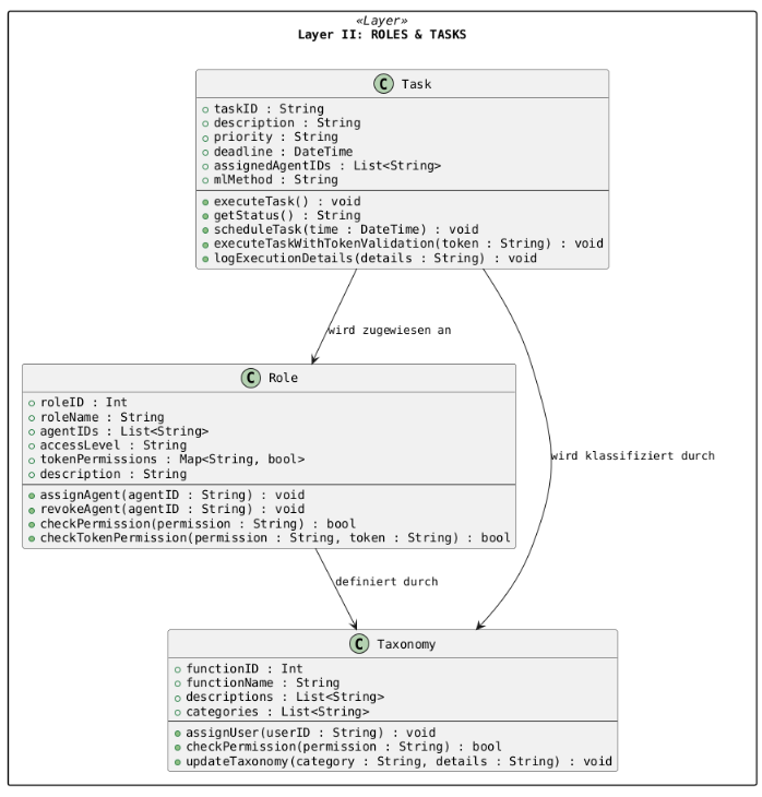 | Layer II: ROLES & TASKS | This layer organizes tasks, roles, and taxonomies, which determine which agents will take on specific tasks and how these tasks are classified and managed. |