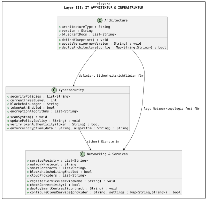| Layer III: IT ARCHITEKTUR & INFRASTRUKTUR | It encompasses the architecture, security concepts (cybersecurity), and network services that form the foundation of the entire system. |