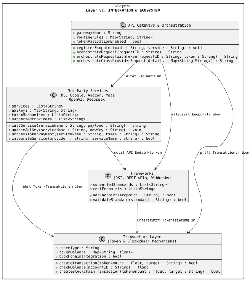 | Layer VI: INTEGRATION & ECOSYSTEM | This layer connects the framework with external services, frameworks, transaction (token) mechanisms, and API gateways, enabling a seamless interplay between internal components and the outside world. |